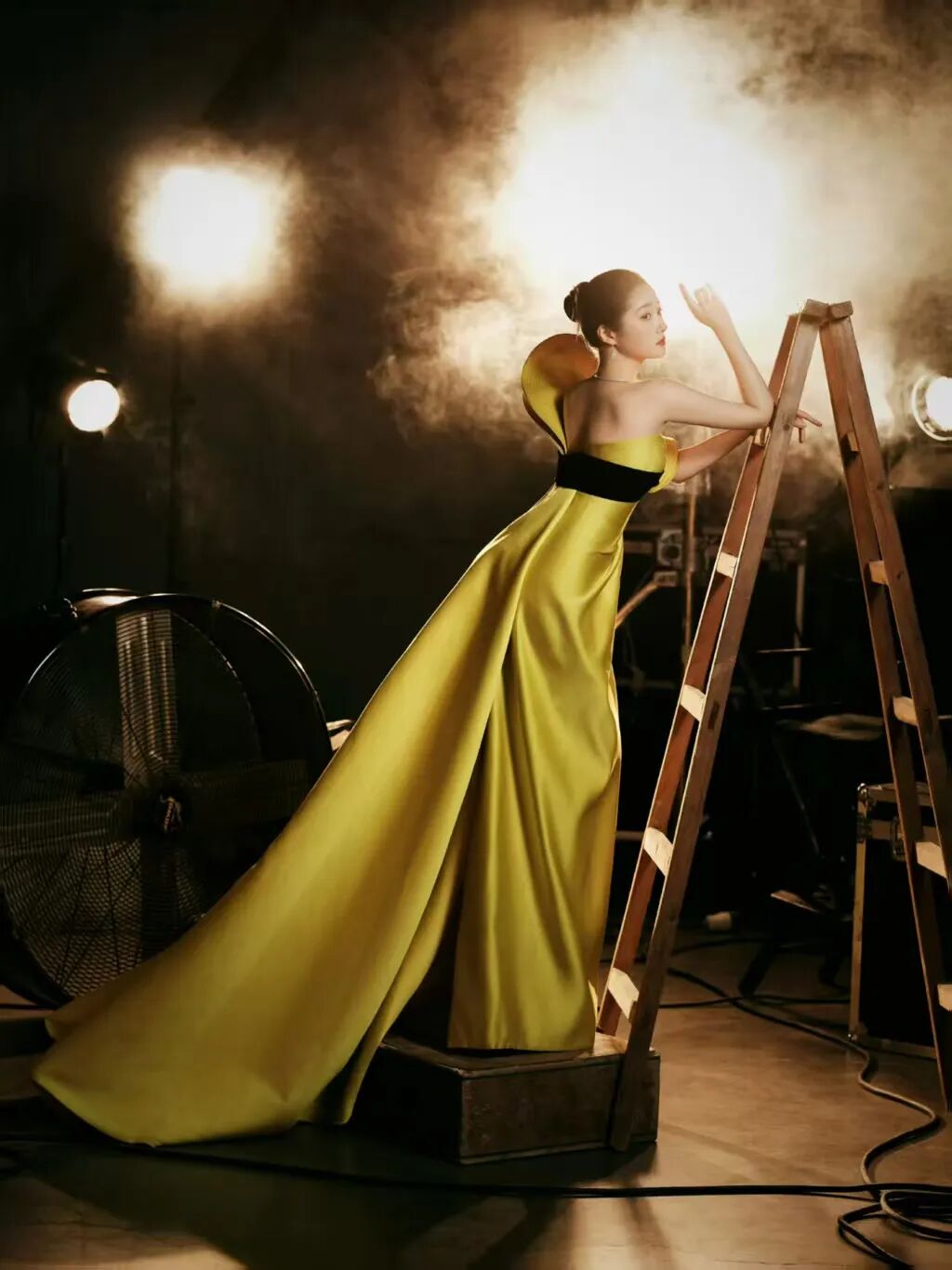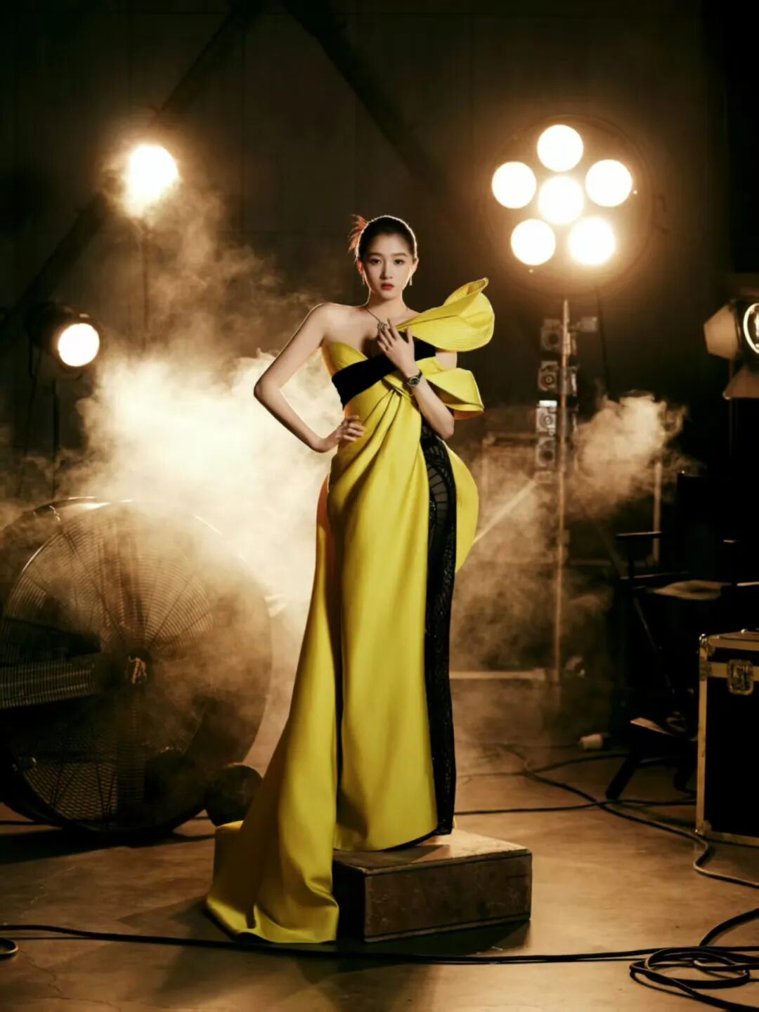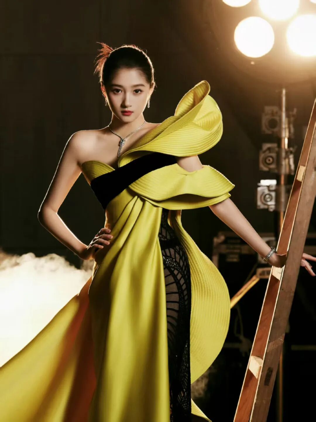 金鸡奖红毯上,关晓彤身着一袭Georges Chakra定制明黄色缎面长裙惊艳亮相,不对称剪裁与立体花瓣相映成趣,裙摆如盛放花束,色彩明艳夺目。