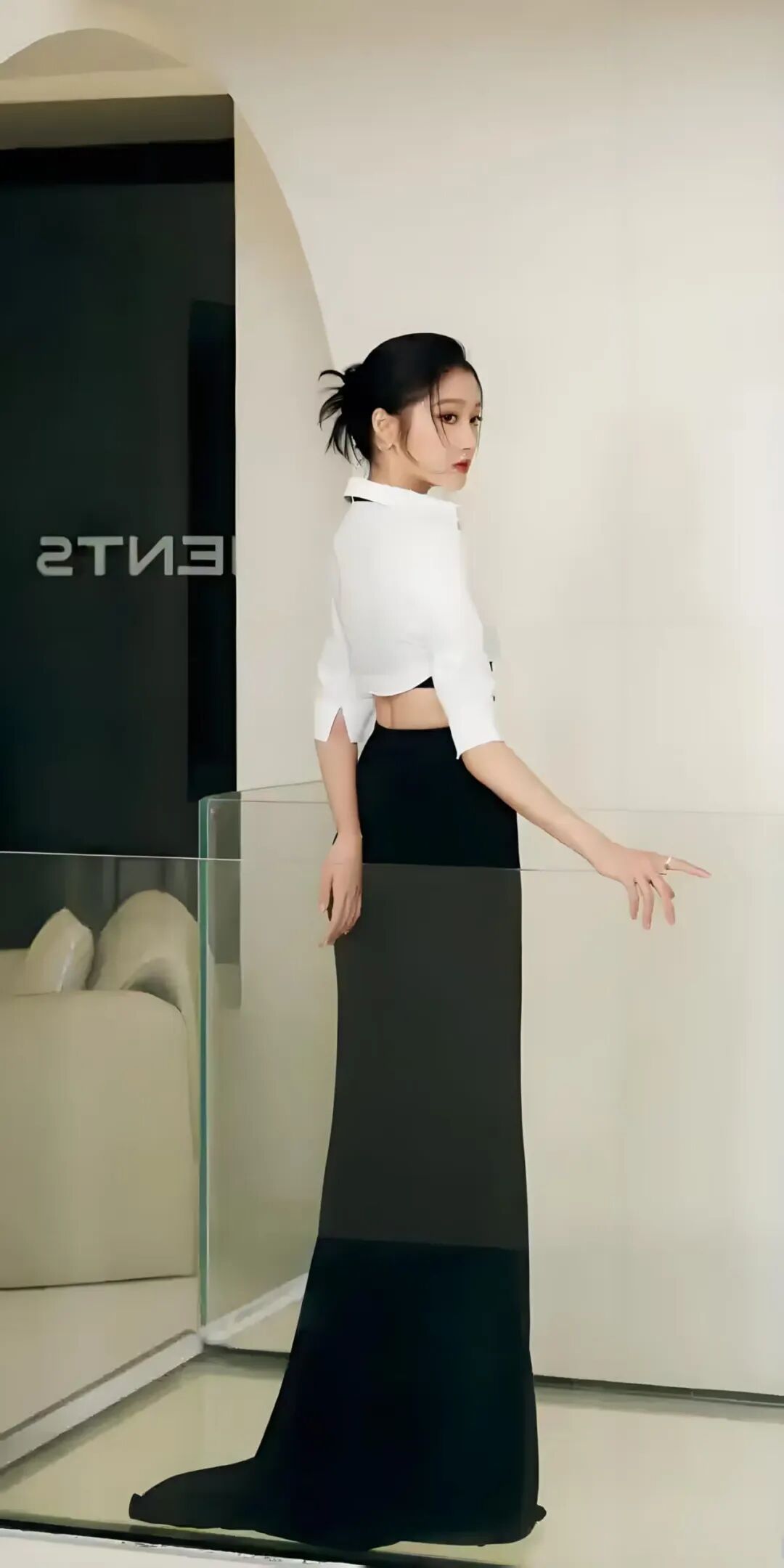 她一身短款长袖白衬衣,黑色高腰长款鱼尾裙,腰线外露,再加上慵懒又随意的挽个丸子头,网上虽赞是“白领丽人范儿”,但露腰设计却意外暴露了腰线比例问题——腰线偏高。