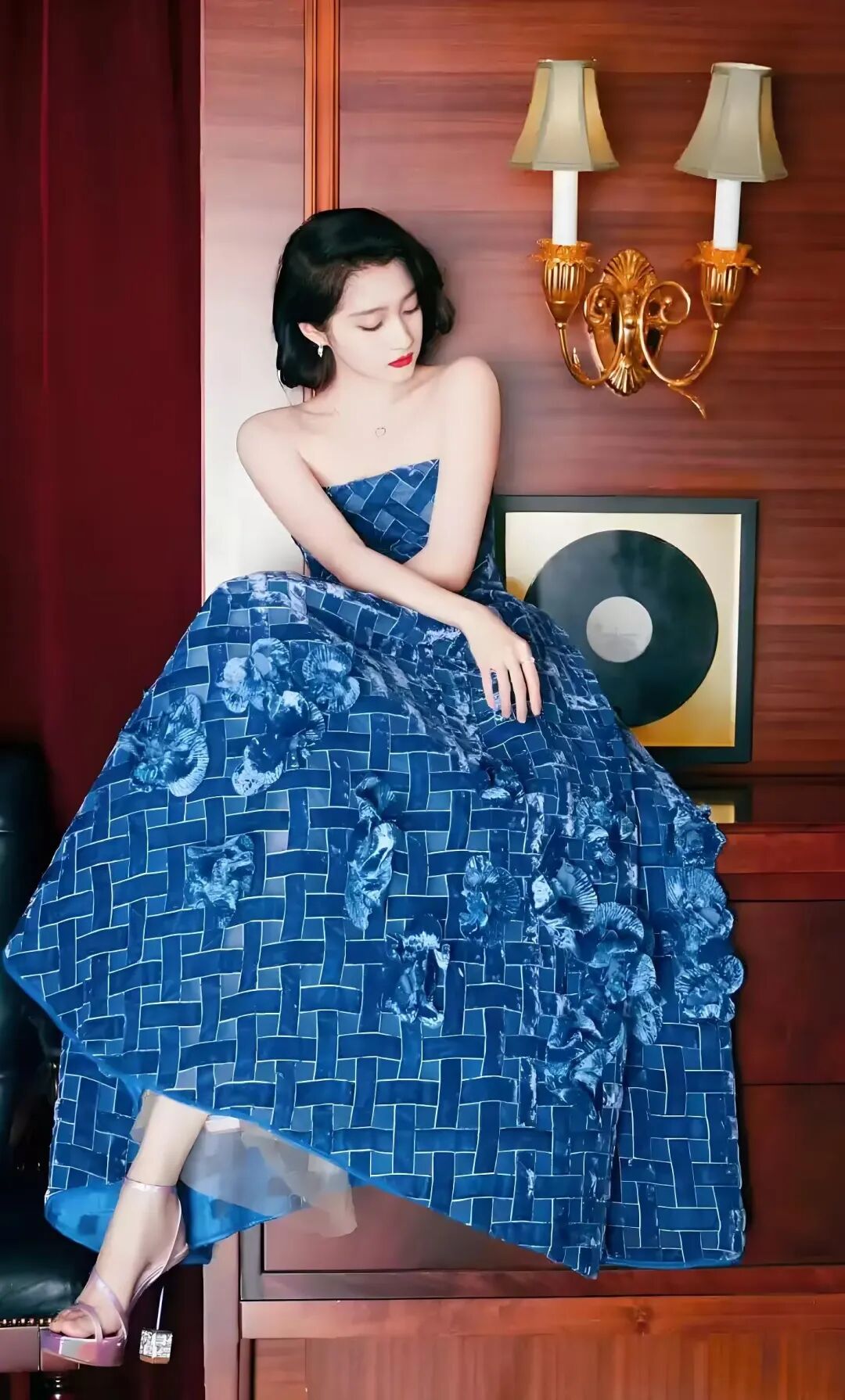 2023年,她换上蓝色格子加花朵抹胸裙,配以港式波浪短卷发,气质温婉工作室定位“复古优雅”。