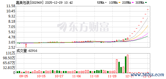 嘉美包装盘中涨停,已连收9个涨停板,截至9:43,该股报10.77元,换手率0.48%正中优配,成交量454.97万股,成交金额4900.05万元,涨停板封单金额为11.21亿元。连续涨停期间,该股累计上涨136.18%,累计换手率为2.99%。最新A股总市值达102.90亿元,A股流通市值102.24亿元。