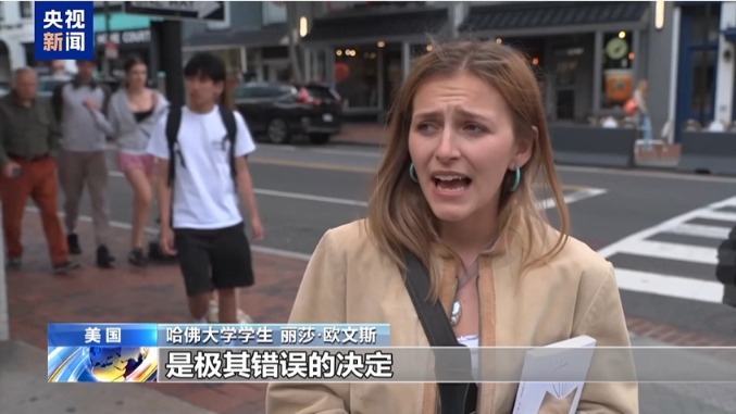 哈佛大学学生蒂罗内·布雷斯怀特:我认为特朗普政府禁止哈佛大学招收国际学生是一个可怕的决定。美国是建立在多样性和“大熔炉”社会的基础之上,我们需要重视每个人,不能因为他们来自不同的地方就歧视他们。